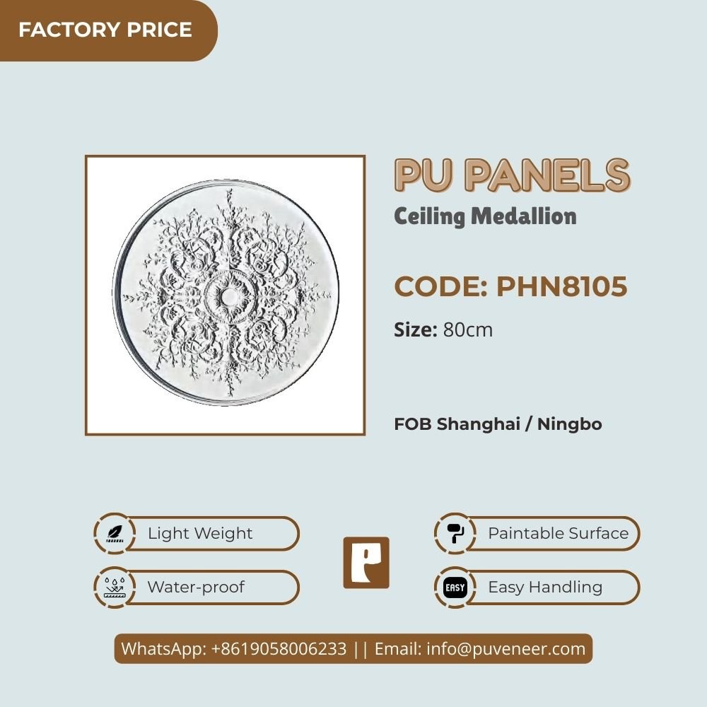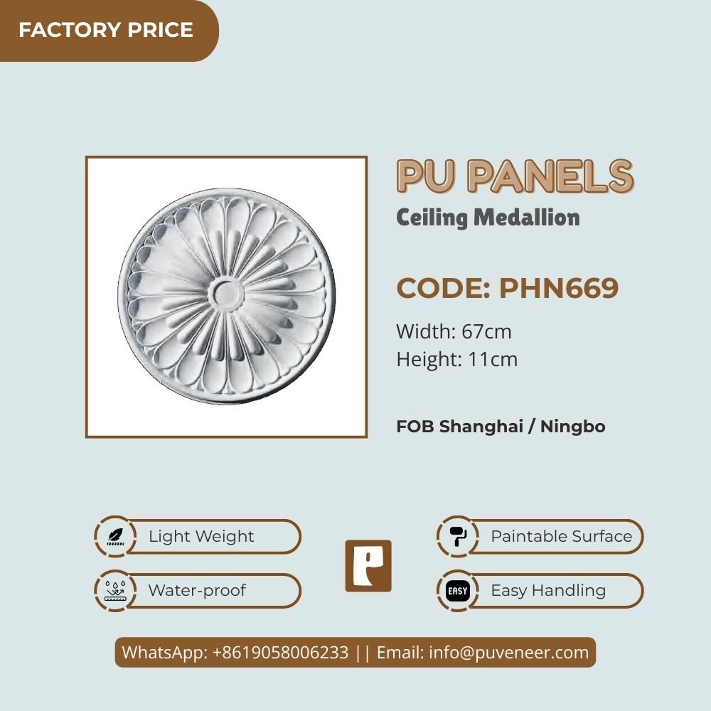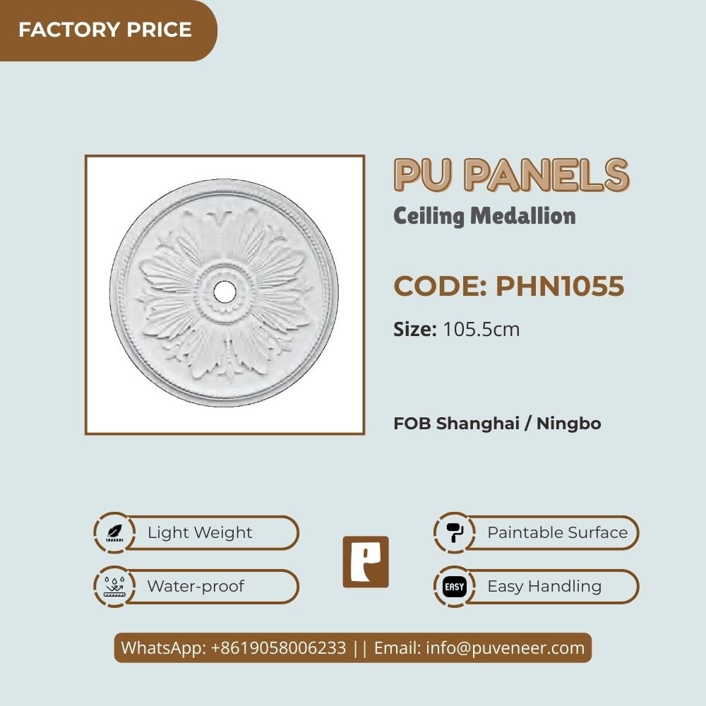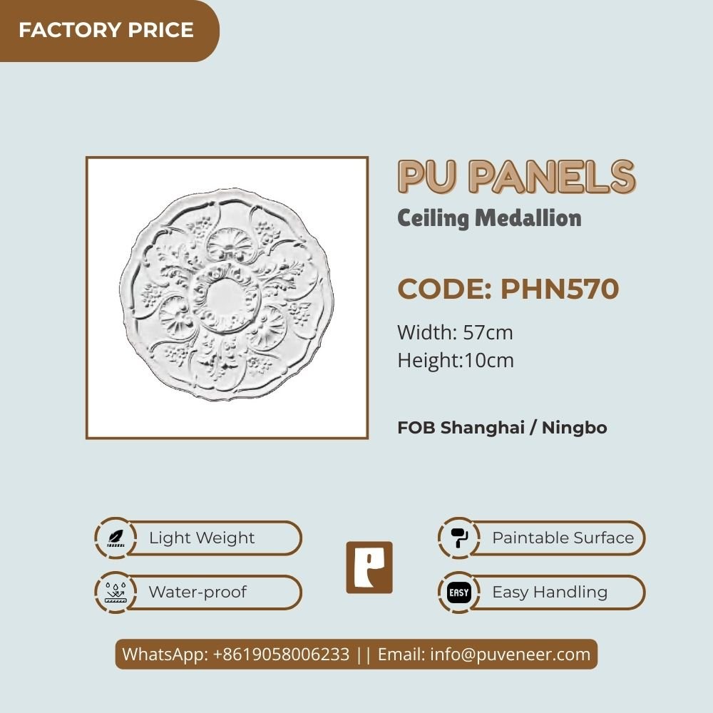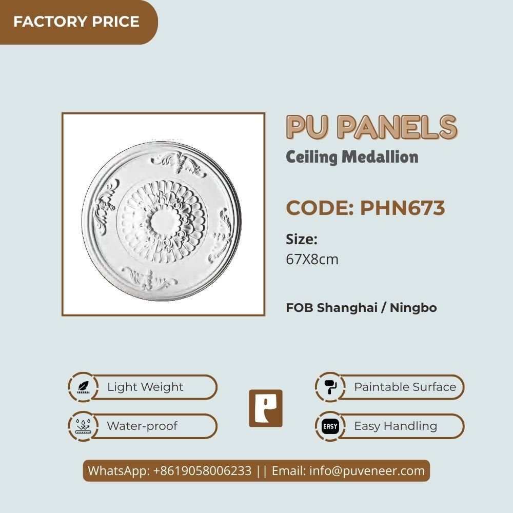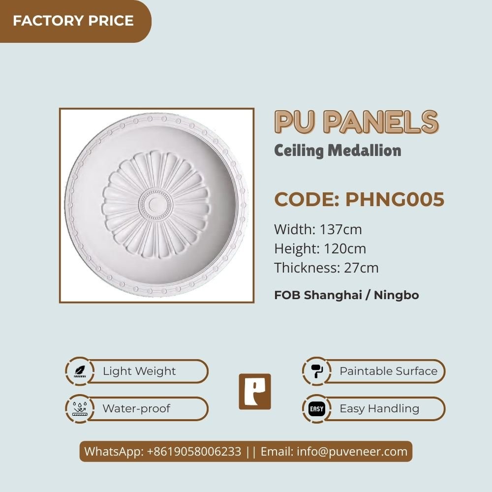 Make your ceiling stand out with our PU Ceiling Medallion. It's made from high-quality polyurethane, which is lightweight but strong. This material offers sharp details and a nice finish without the heaviness of traditional plaster. It resists moisture so that it won't crack or warp over time. Plus, it's easy to install without needing special tools or extra help. Choose this modern design to effortlessly add character to your space.
